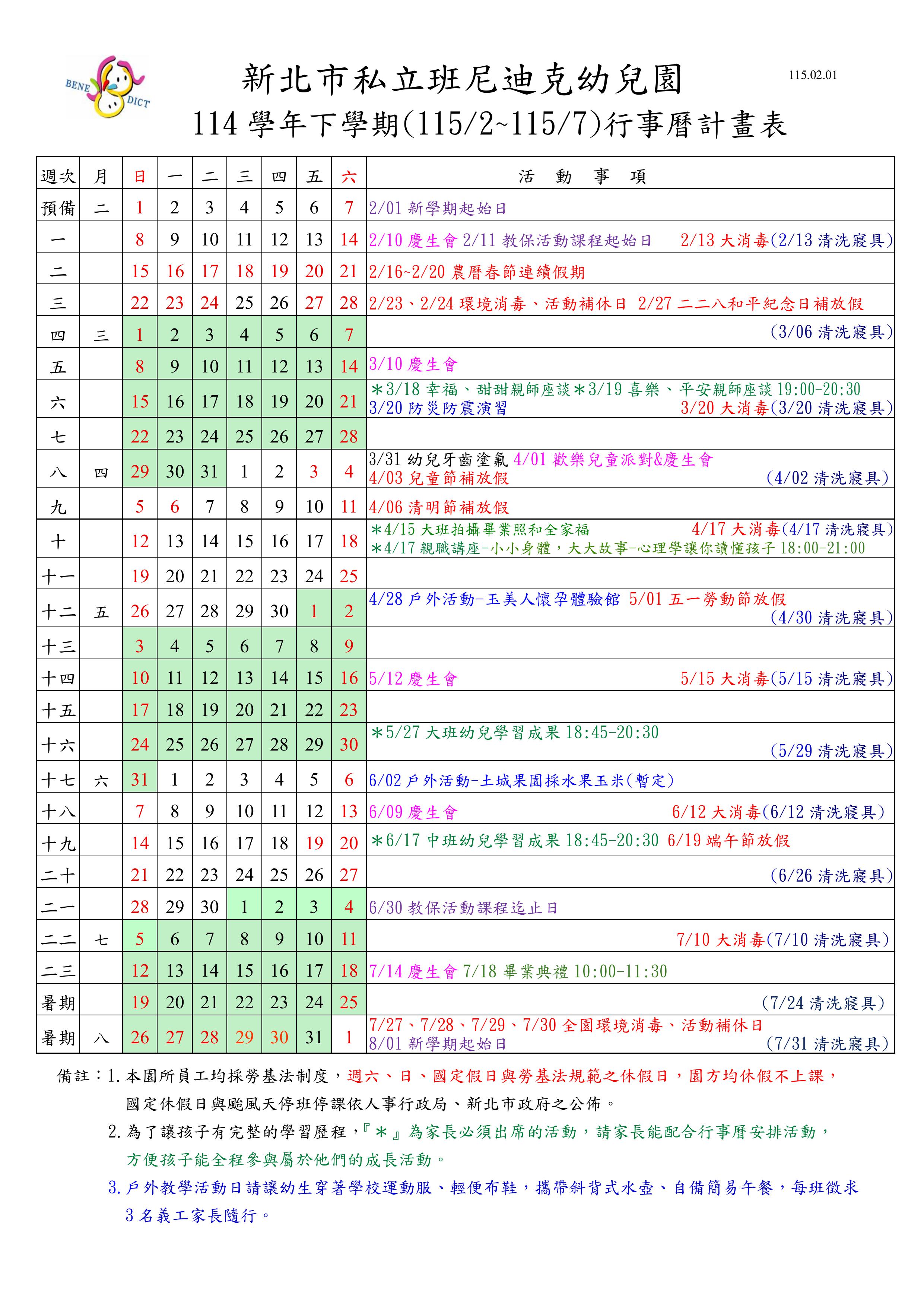 114學年度第二學期行事曆計畫表