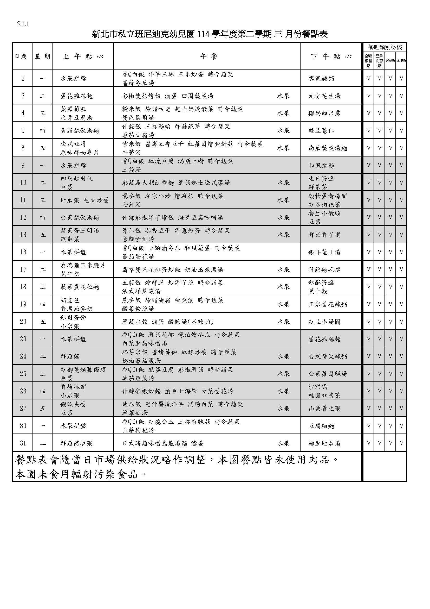 115年3月餐點表
